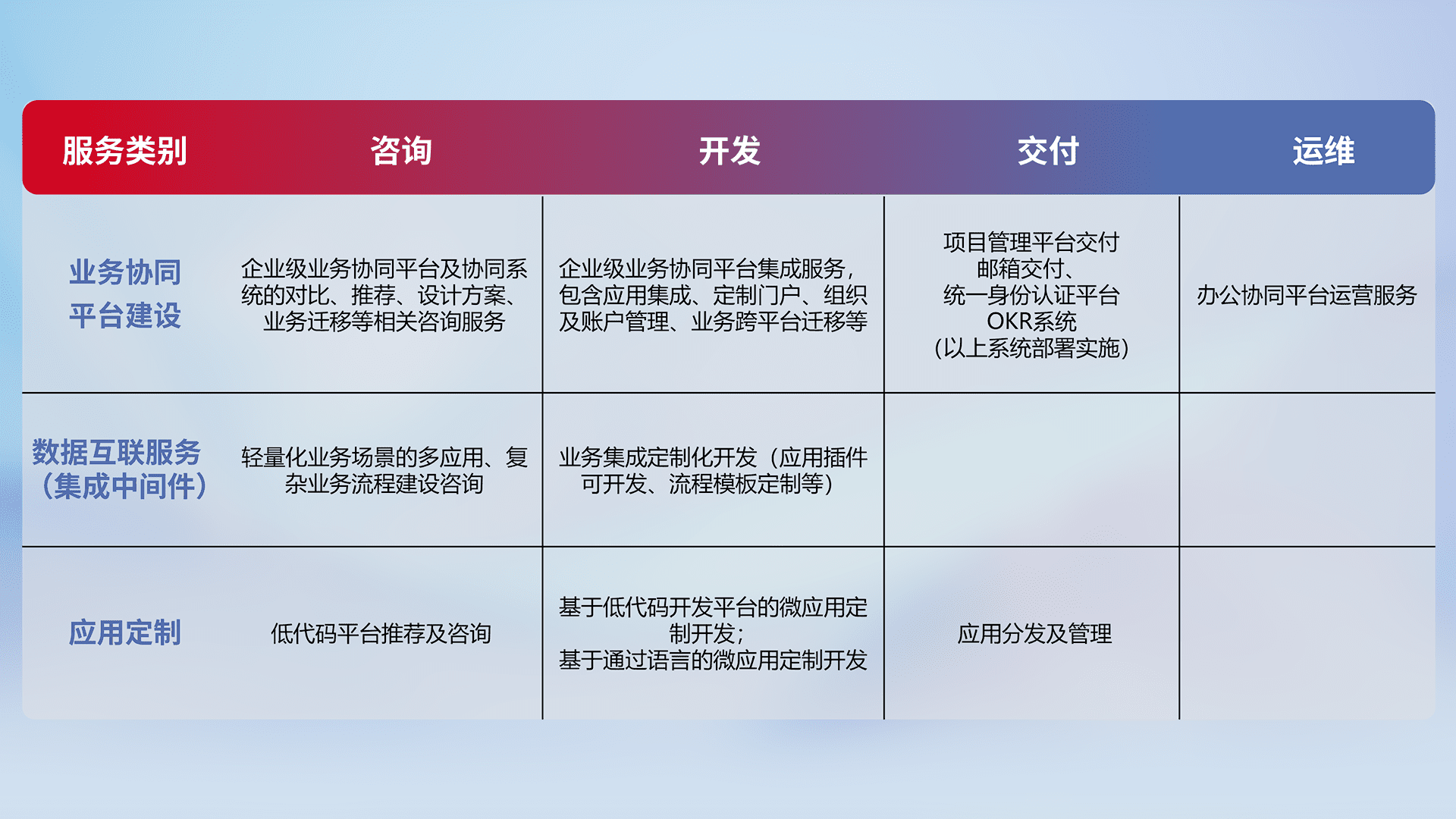 针对钉钉、、、企微、、IDaas等平台级产品提供产品的规划、、、、方案、、交付、、定制化开发等服务,,实现如统一协同办公、、、智能客户服务、、、、混合会议管理、、、、智能数据查询、、、等业务场景,,,实现数字化转型。。。